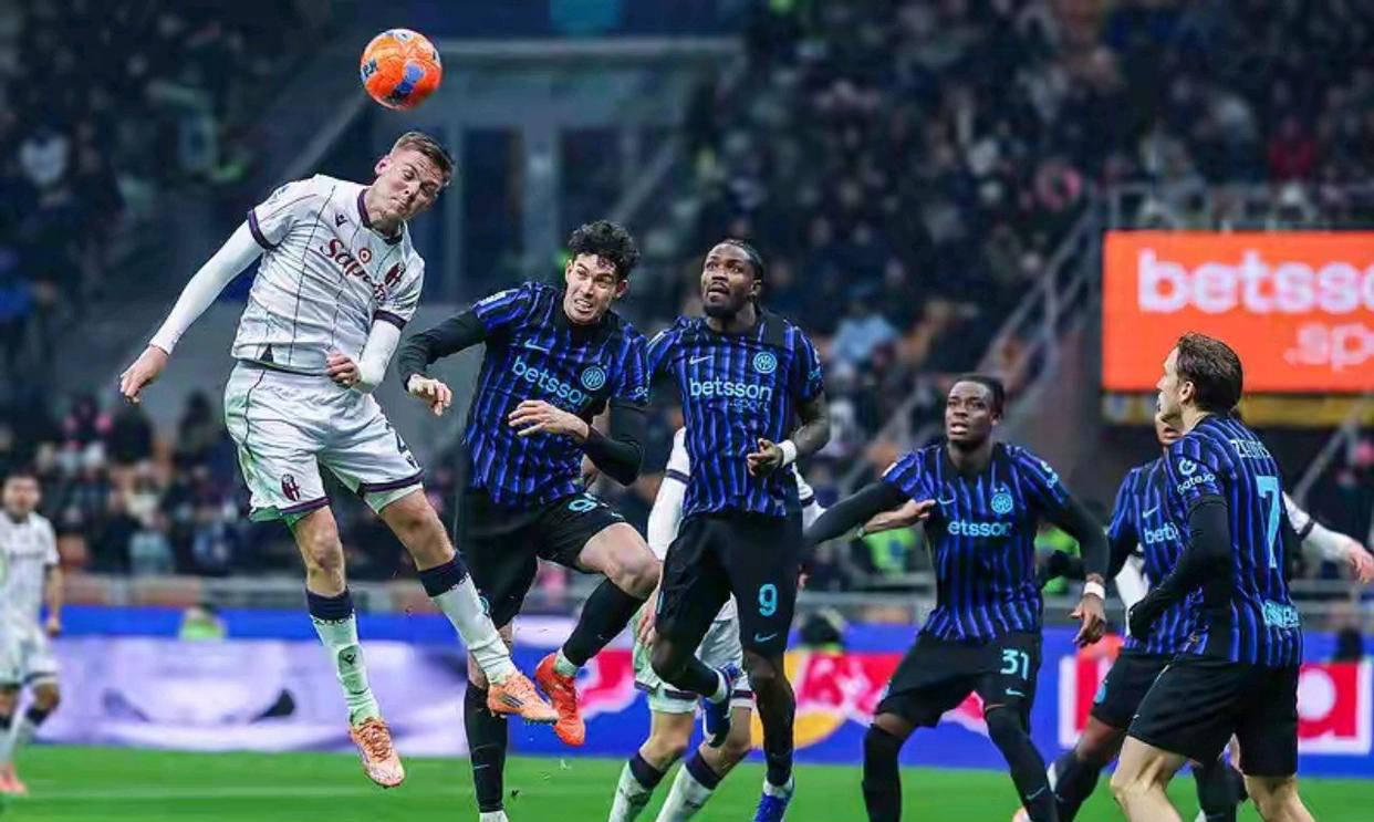 比赛进行到第75分钟,国米奉献了全场最具戏剧性的进球。图拉姆在禁区内接到队友传中,面对无法用脚控制球的尴尬局面,他灵机一动侧身用肩膀将球猛然撞入球门。这个富含力量感的“肩膀射门”让博洛尼亚门将无奈失守,比分锁定在3-0,胜负基本失去悬念。